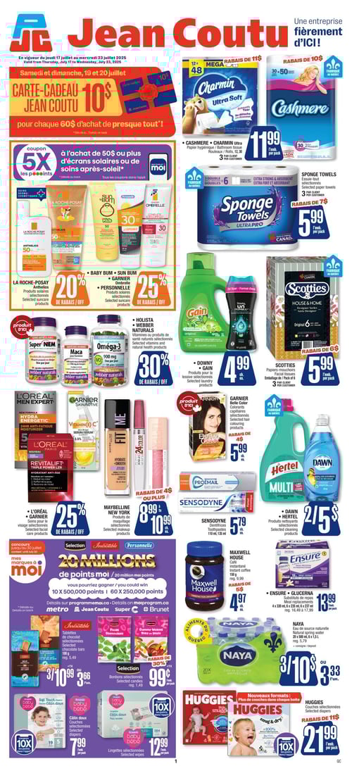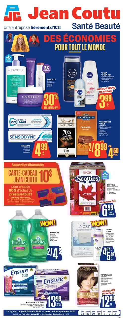 Consultez la plus récente circulaire en image de Jean Coutu, pour y découvrir tous leurs spéciaux de la semaine. De plus, vous avez aussi accès aux promotions sur tous les produits de soins de santé et de beauté.