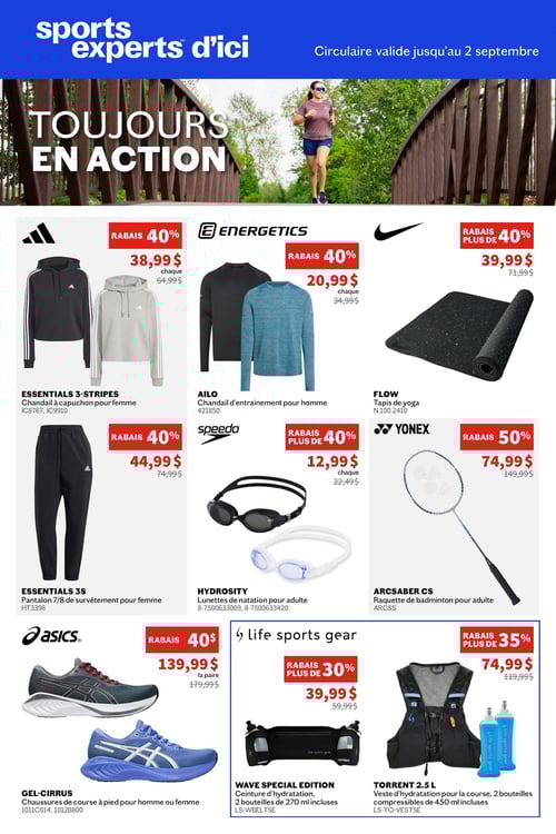 Consultez la plus récente circulaire en image de Sports Experts, pour y découvrir tous leurs spéciaux de la semaine. De plus, vous avez aussi accès aux promotions sur tous les vêtements, accessoires et équipements de sport.